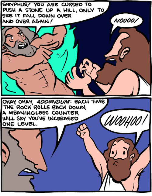 From Saturday Morning Breakfast Cereal, a perfect encapsulation of Fitocracy’s diabolically effective stickiness: made-up points that don’t mean anything. But while Sisyphus may get the dopamine squirt he needs from watching his meaningless, imaginary level climb, the fitness he develops is his to keep.