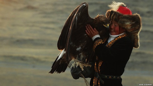 The Kazakhs of the Altai mountain range in western Mongolia are the only people that hunt with golden eagles, and today there are around 400 practising falconers. Ashol-Pan, the daughter of a particularly celebrated hunter, may well be the country’s only apprentice huntress. —A 13-year-old eagle huntress in Mongolia