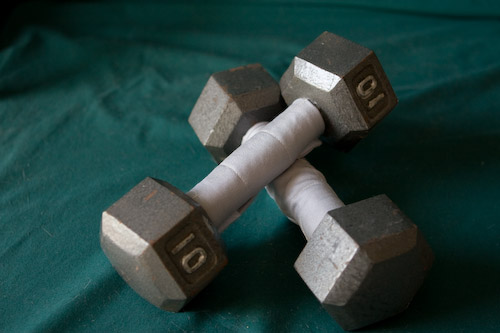 I’ve been trying to use dumbbells lately (mostly as wrist supports for pushups), and I find I don’t want to touch them because they are cold and a little rusted, so I made handles for em.