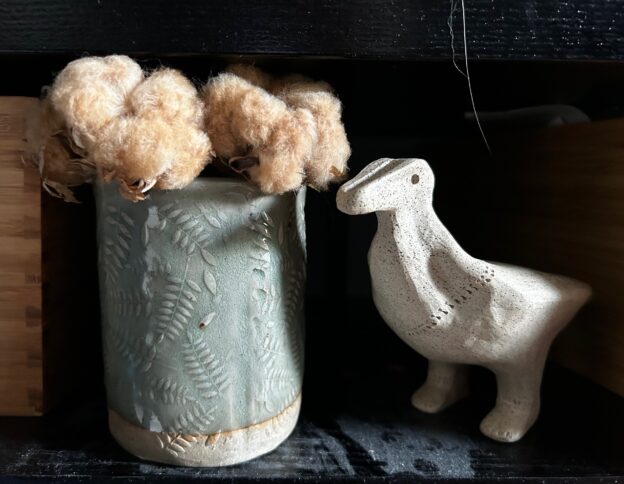 a ceramic cup with cotton bolls in it, like a vase of flowers, beside a ceramic bird rattle